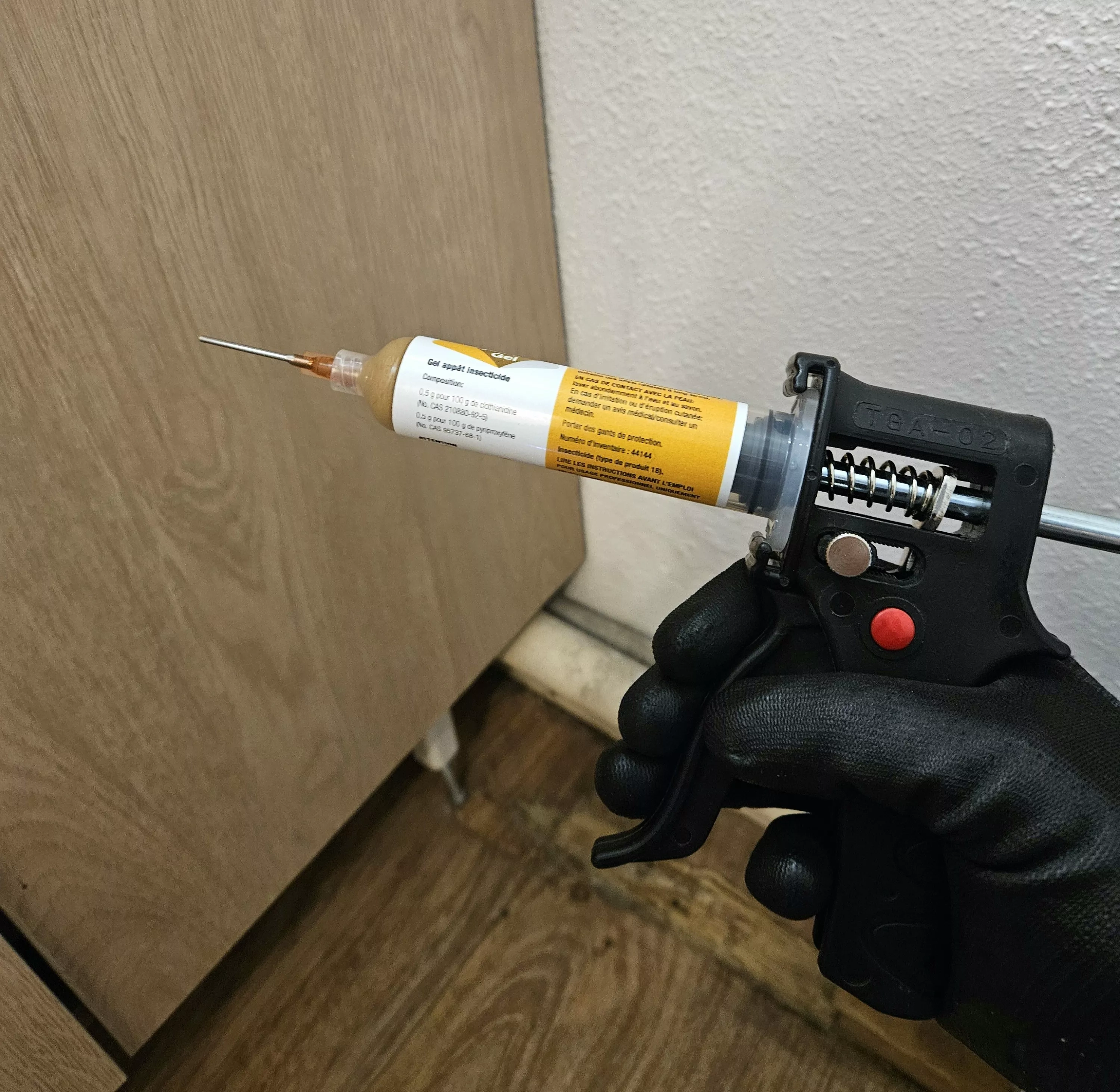 Nous avons privilégié l'application d'un gel insecticide professionnel à effet retard. Ce gel est déposé en micro-points dans les zones de passage et les cachettes identifiées. Les blattes consomment le gel et le transportent au nid, créant une contamination en chaîne qui élimine la reine et les nymphes, assurant la destruction de toute la colonie. C'est la méthode la plus efficace et la moins invasive pour les locaux sensibles (cuisine, santé).
